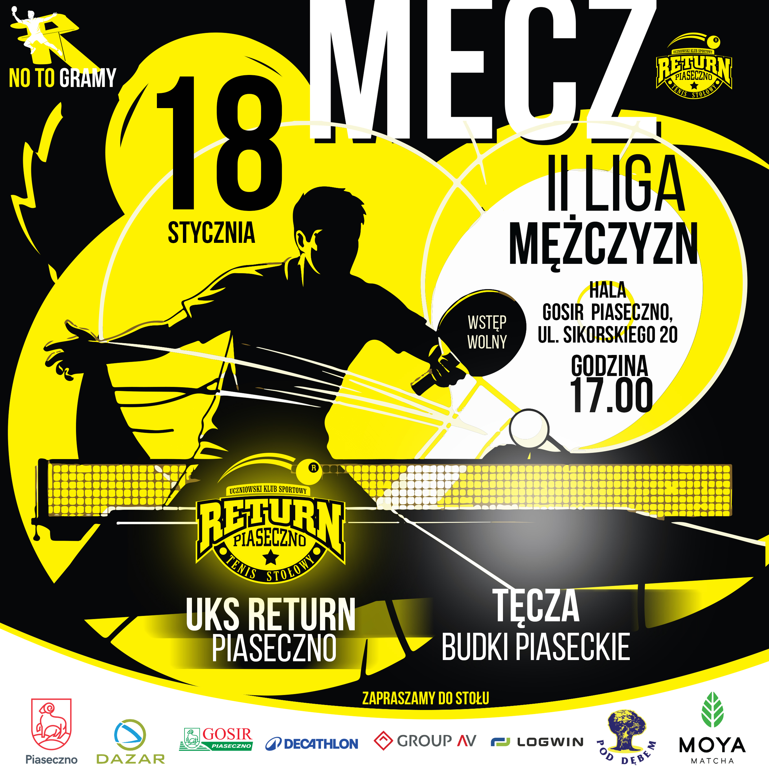 W sobotę 18 stycznia o godzinie 17:00 tenisiści stołowi UKS Return Piaseczno znów zagrają przed własną publicznością w rozgrywkach II ligi mężczyzn. Ich rywalem będzie Tęcza Budki Piaseckie. Po dziewięciu kolejkach drużyna z Piaseczna jest na trzecim miejscu w tabeli z niewielką stratą do lidera, goście z Budek Piaseckich zajmują ósmą lokatę.