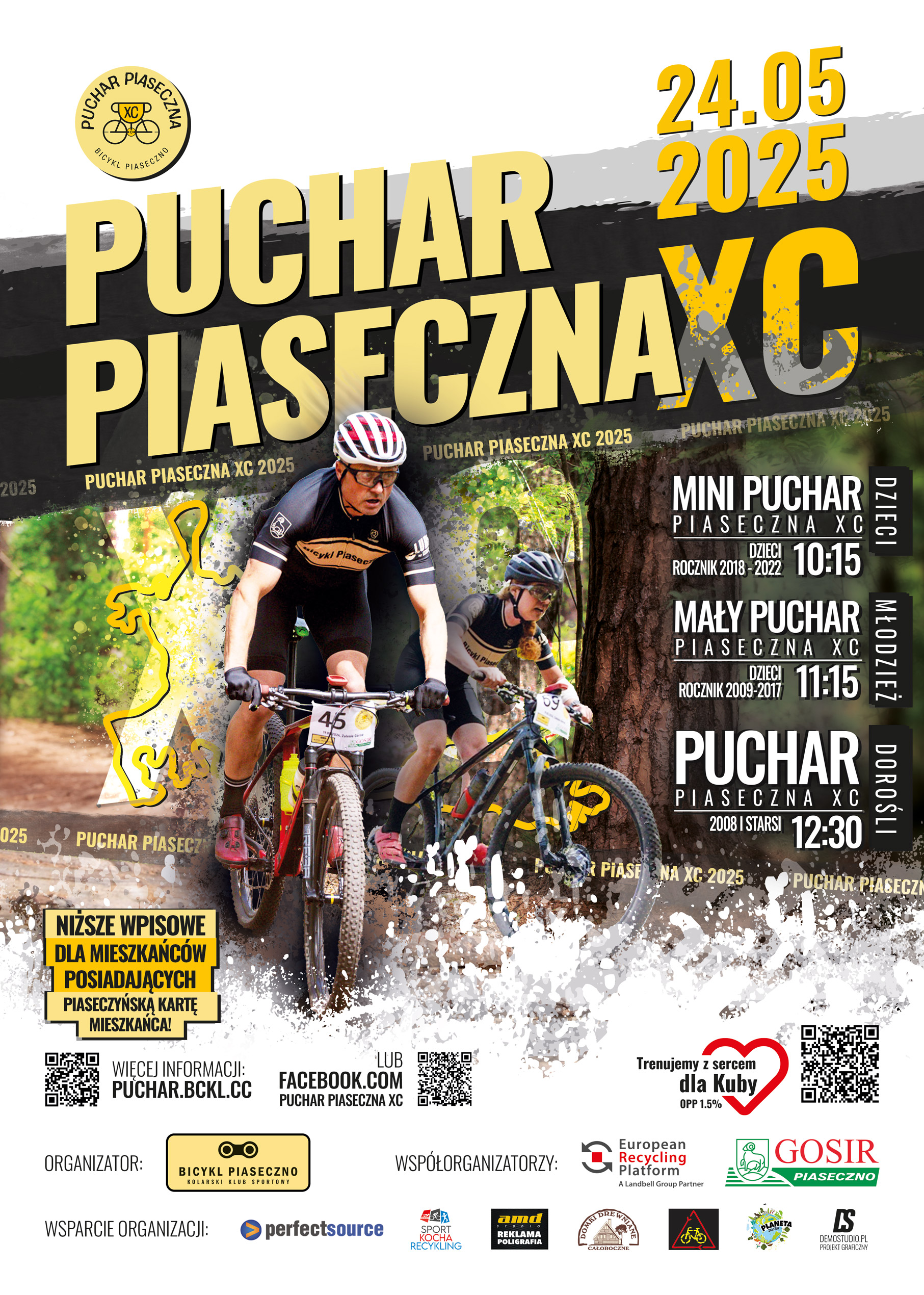 Masz ochotę na sportową przygodę pełną emocji? Już 24 maja zapraszamy na Puchar Piaseczna w kolarstwie górskim XC! Na legendarnej trasie Super Mario zmierzą się mali i duzi, początkujący i doświadczeni zawodnicy. Każdy znajdzie tu coś dla siebie!