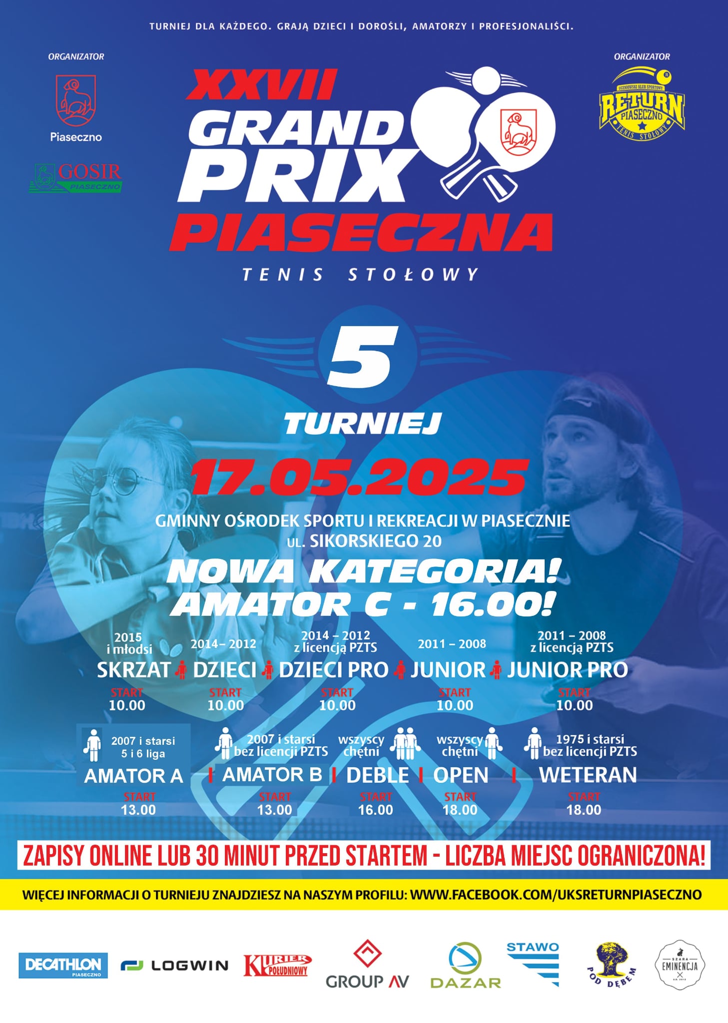 W sobotę 17 maja rozegramy kolejny turniej XXVII edycji Grand Prix Piaseczna w tenisie stołowym.Turniej rozgrywany nieprzerwanie od 26 lat jest wyjątkowy pod wieloma względami. Oto niektóre powody, dla których warto przyjść na halę Gminnego Ośrodka Sportu i Rekreacji w Piasecznie: