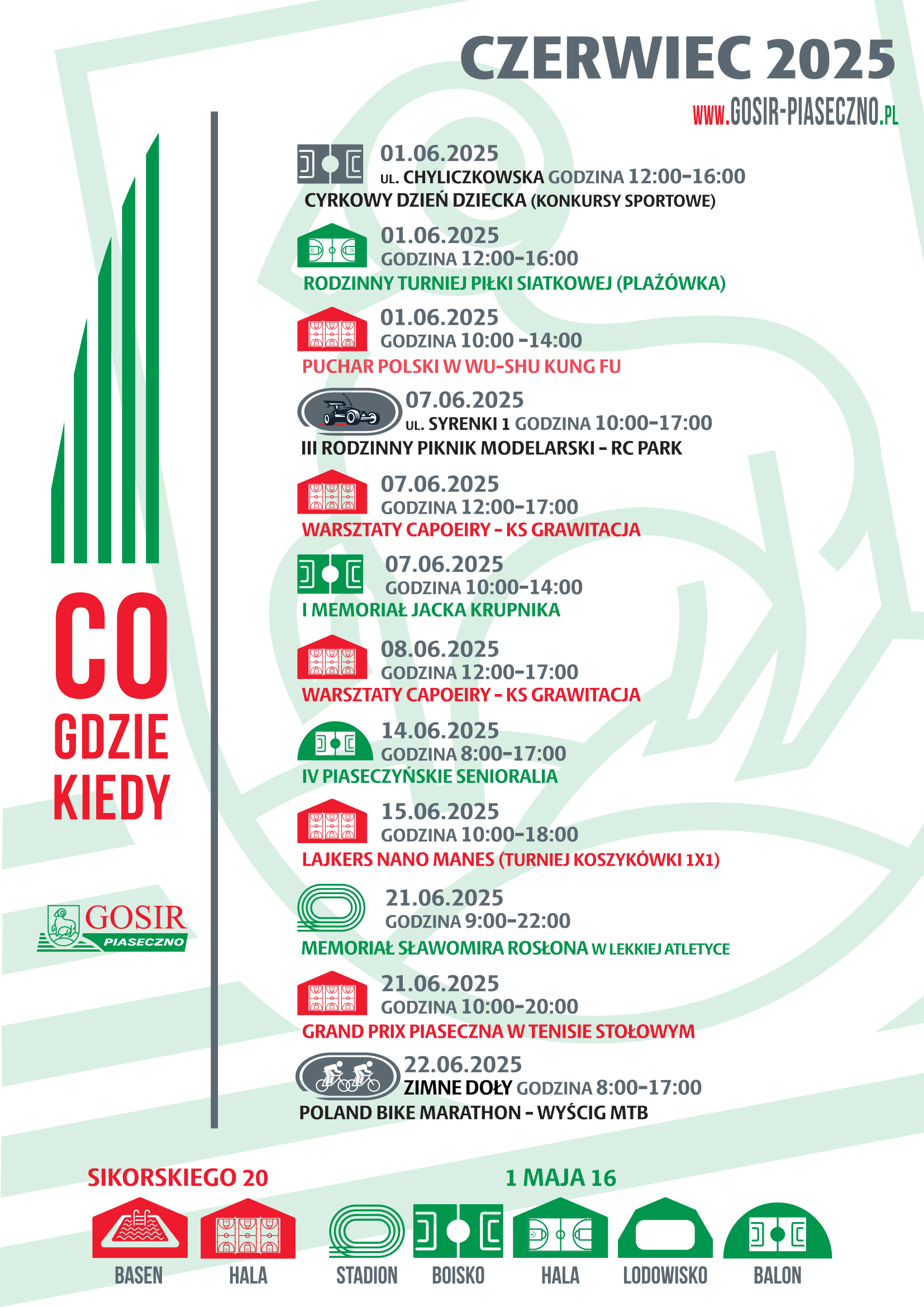 Serdecznie zapraszamy do zapisów na półkolonie w okresie wakacji letnich dla dzieci w wieku 6-12 lat (dzieci ur. w latach 2013-2019) – “Sportowe Lato w Mieście” Piaseczno 2025 r. Formularz zgłoszeniowy dostępny będzie na stronie www.gosir-piaseczno.pl od dnia 04.06.2025 od godziny 10:00. Koszt uczestnictwa wynosi 700 zł/turnus.