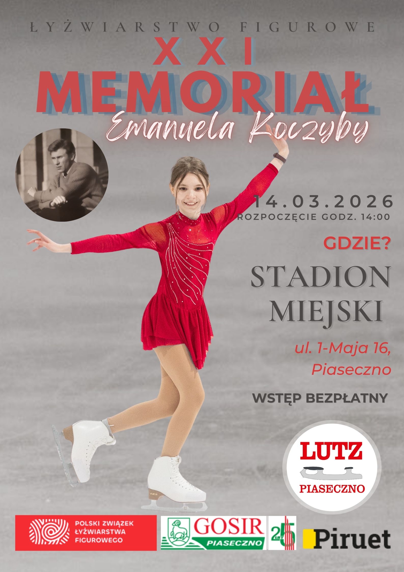 Klub Sportowy Lutz Piaseczno ma zaszczyt zaprosić wszystkich miłośników łyżwiarstwa figurowego na zawody "XXI Memoriał Emanuela Koczyby w łyżwiarstwie figurowym", które odbędą się 14 marca 2026 (sobota) na piaseczyńskim lodowisku (ul. 1-Maja 16, Piaseczno).