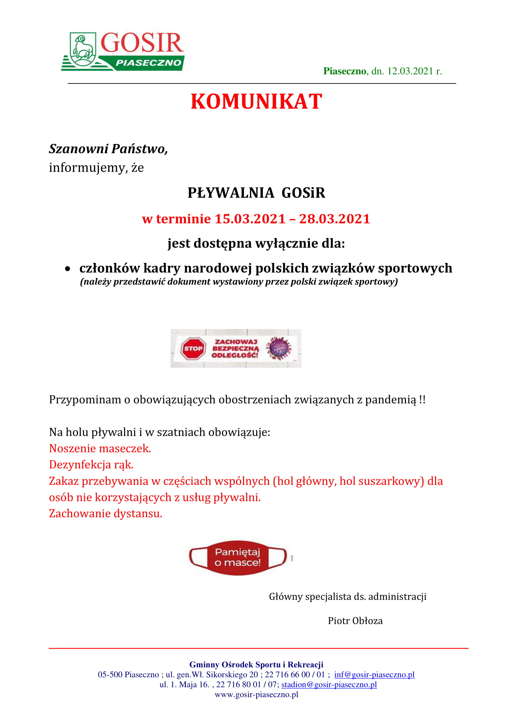 PŁYWALNIA  GOSiR w terminie 15.03.2021 – 28.03.2021 jest dostępna wyłącznie dla: