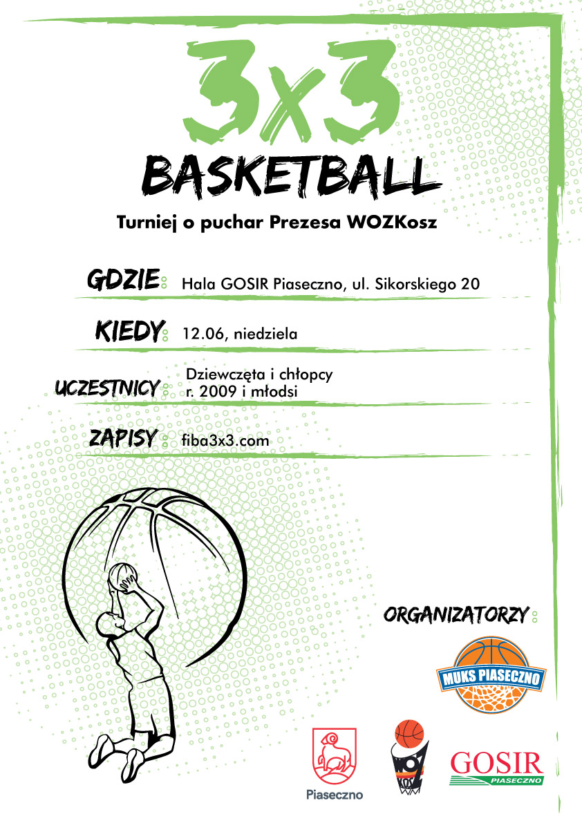 Już w najbliższą sobotę w sali Gminnego Ośrodka Sportu i Rekreacji odbędzie się turniej koszykówki 3x3, dyscypliny która znajduje sobie coraz więcej sympatyków w kraju i na świecie. Zawody rozegrane zostaną zarówno dla młodzieży jak i osób dorosłych. Patronat nad imprezą objął Burmistrz Miasta i Gminy Piaseczno. Zapraszamy sympatyków koszykówki do dopingowania drużyn, a drużyny do zgłaszania się do zawodów - więcej szczegółów na plakatach.