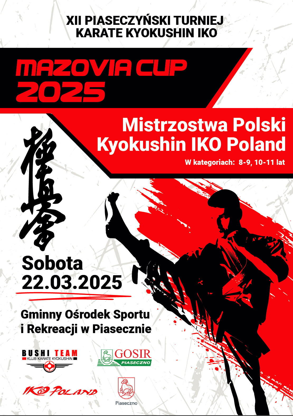 Już w najbliższą sobotę (22 marca) w sali Gminnego Ośrodka Sportu i Rekreacji w Piasecznie odbędzie się ogólnopolski turniej karate kyokushin, którego organizatorem jest UKS BUSHI TEAM Piaseczno. Ponadto tegoroczna edycja będzie wyjątkowa dla młodych zawodników w wieku 8-11 lat ponieważ zawody będą uznawane za Mistrzostwa Polski w tej kategorii wiekowej.