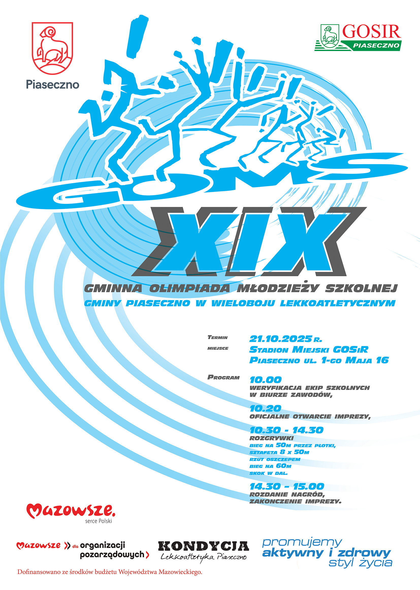Przed nami Gminna Olimpiada Młodzieży Szkolnej. Impreza sportowa, w której udział biorą młodzi uczniowie ze Szkół Podstawowych funkcjonujących na terenie Gminy Piaseczno. GOMS to świetna okazja dla najmłodszych do spróbowania swoich sił w kilku lekkoatletycznych konkurencjach i możliwość rywalizacji na profesjonalnym obiekcie Stadionu Miejskiego w Piasecznie. Start imprezy godzina 10:00