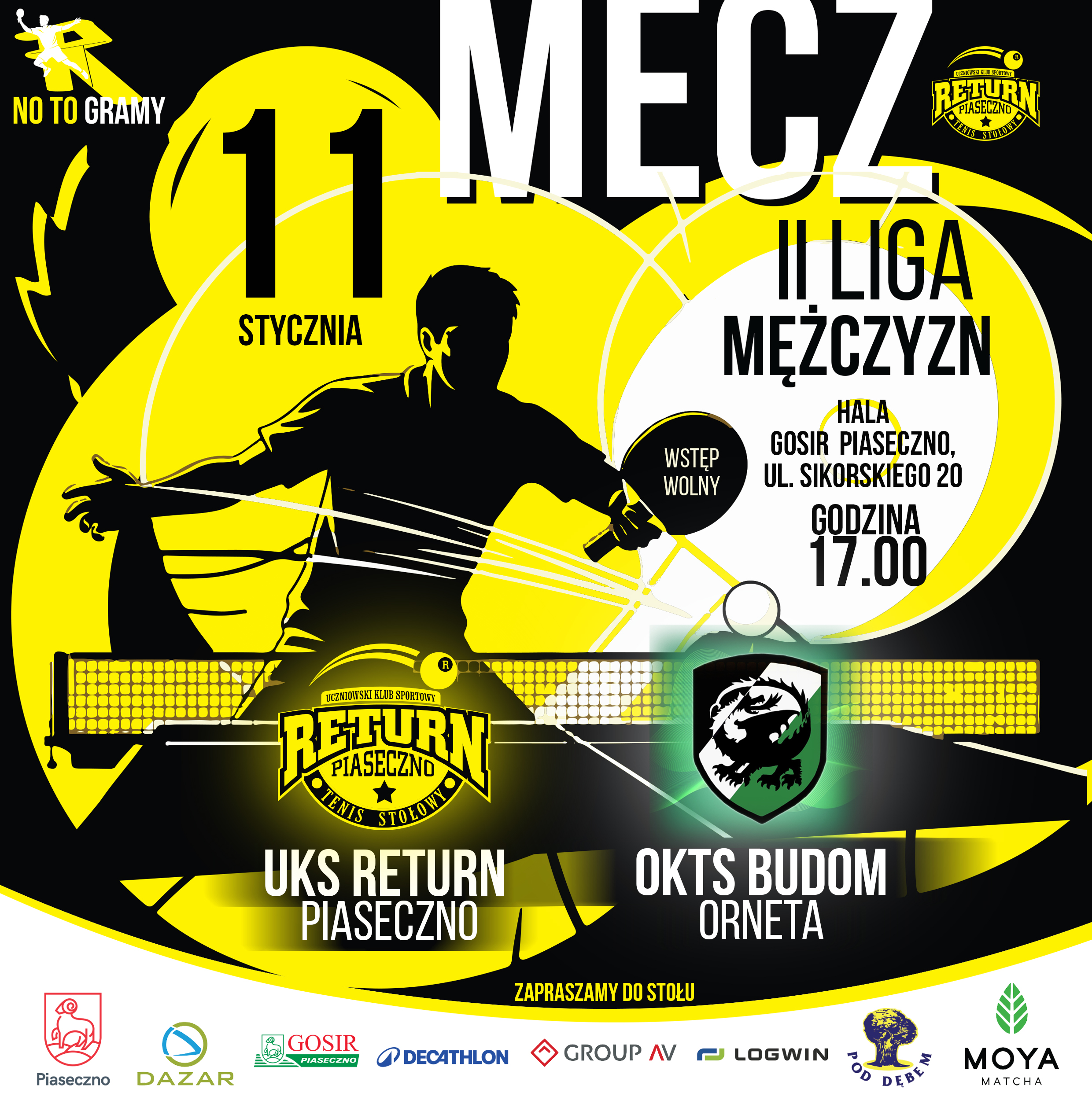 W sobotę 11 stycznia o godzinie 17:00 tenisiści stołowi UKS Return Piaseczno po raz pierwszy w tym roku zagrają przed własną publicznością w rozgrywkach II ligi mężczyzn. Ich rywalem będzie OKTS Budom Orneta. Zapowiada się zacięty mecz pełen wielu widowiskowych wymian ponieważ oba zespoły sąsiadują ze sobą w tabeli mając tę samą liczbę 13 punktów.