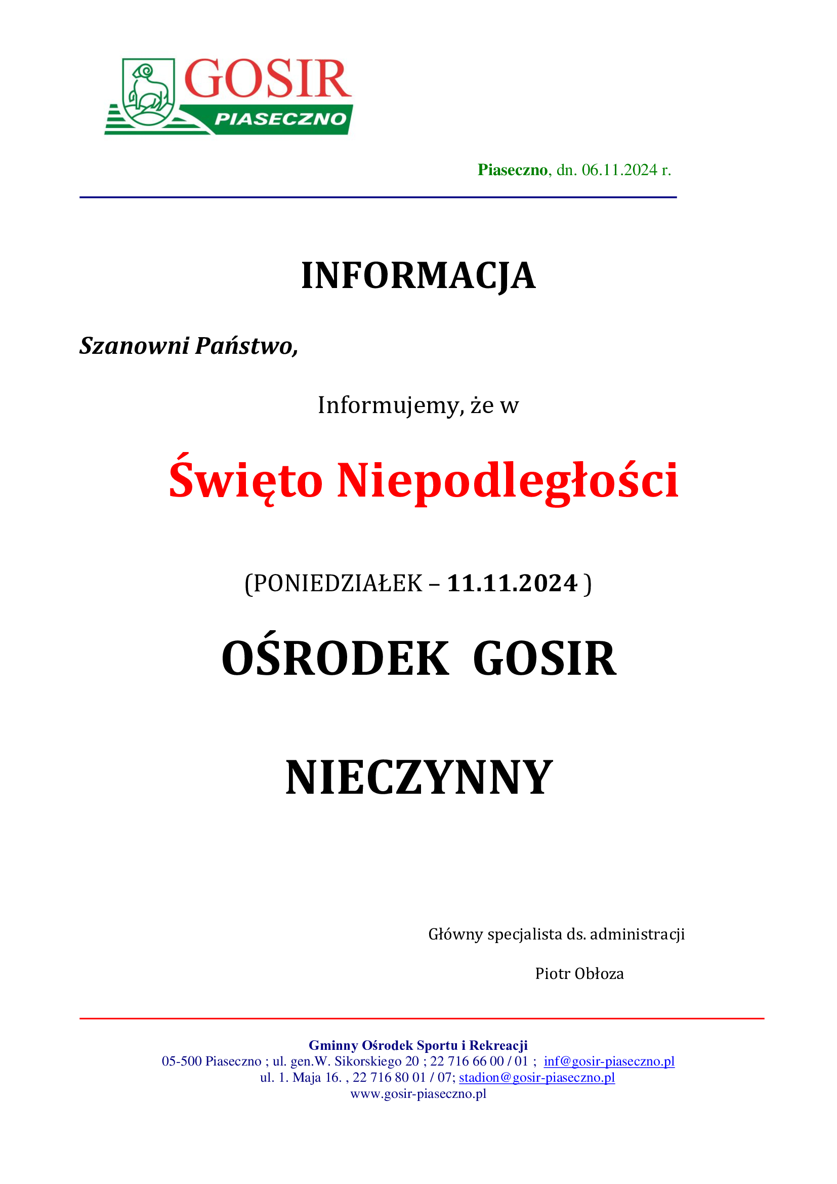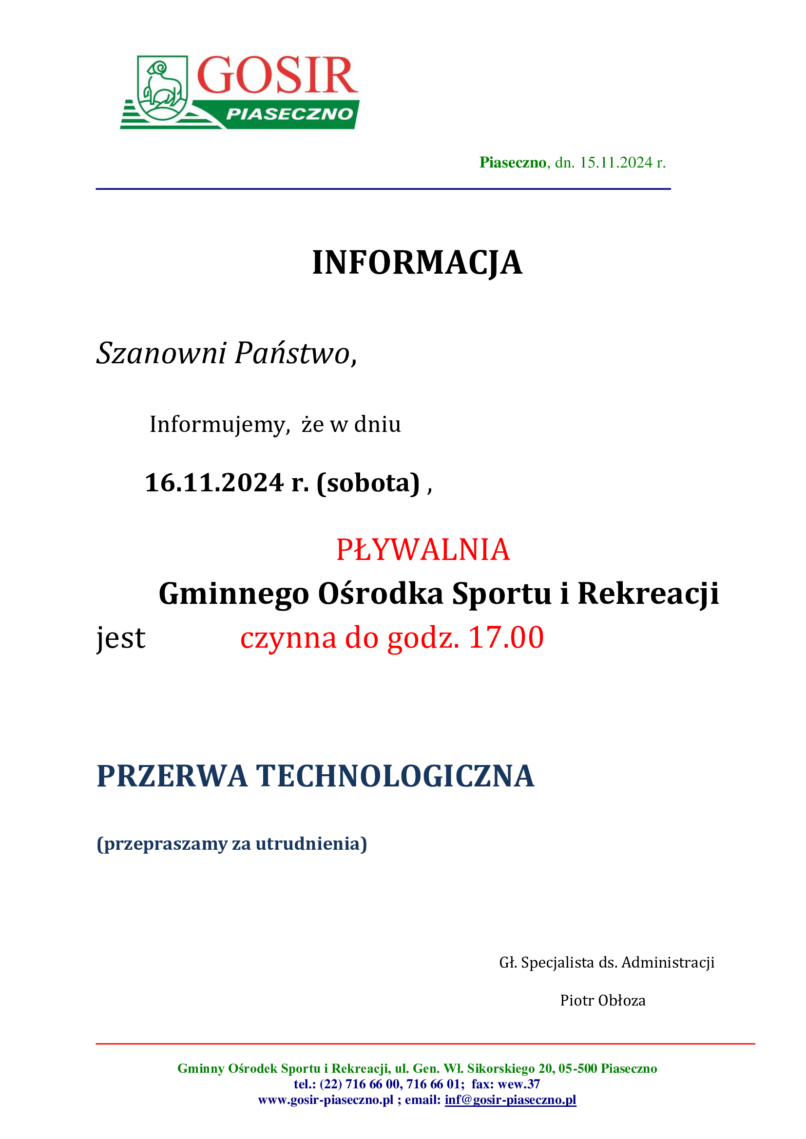Chcielibyśmy poinformować, że w dniu 22 listopada 2024 lodowisko będzie nieczynne w godzinach 20:15 - 21:30.