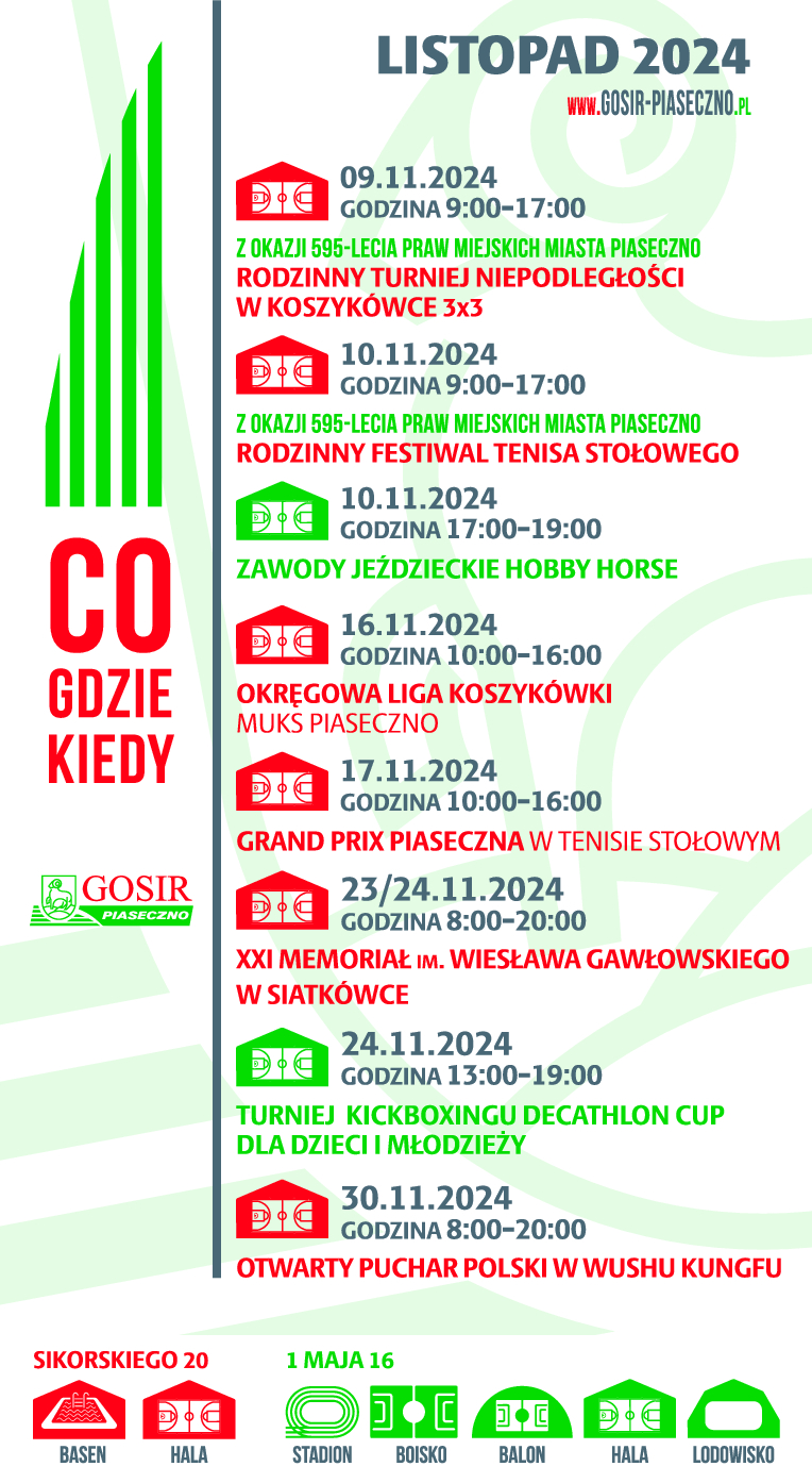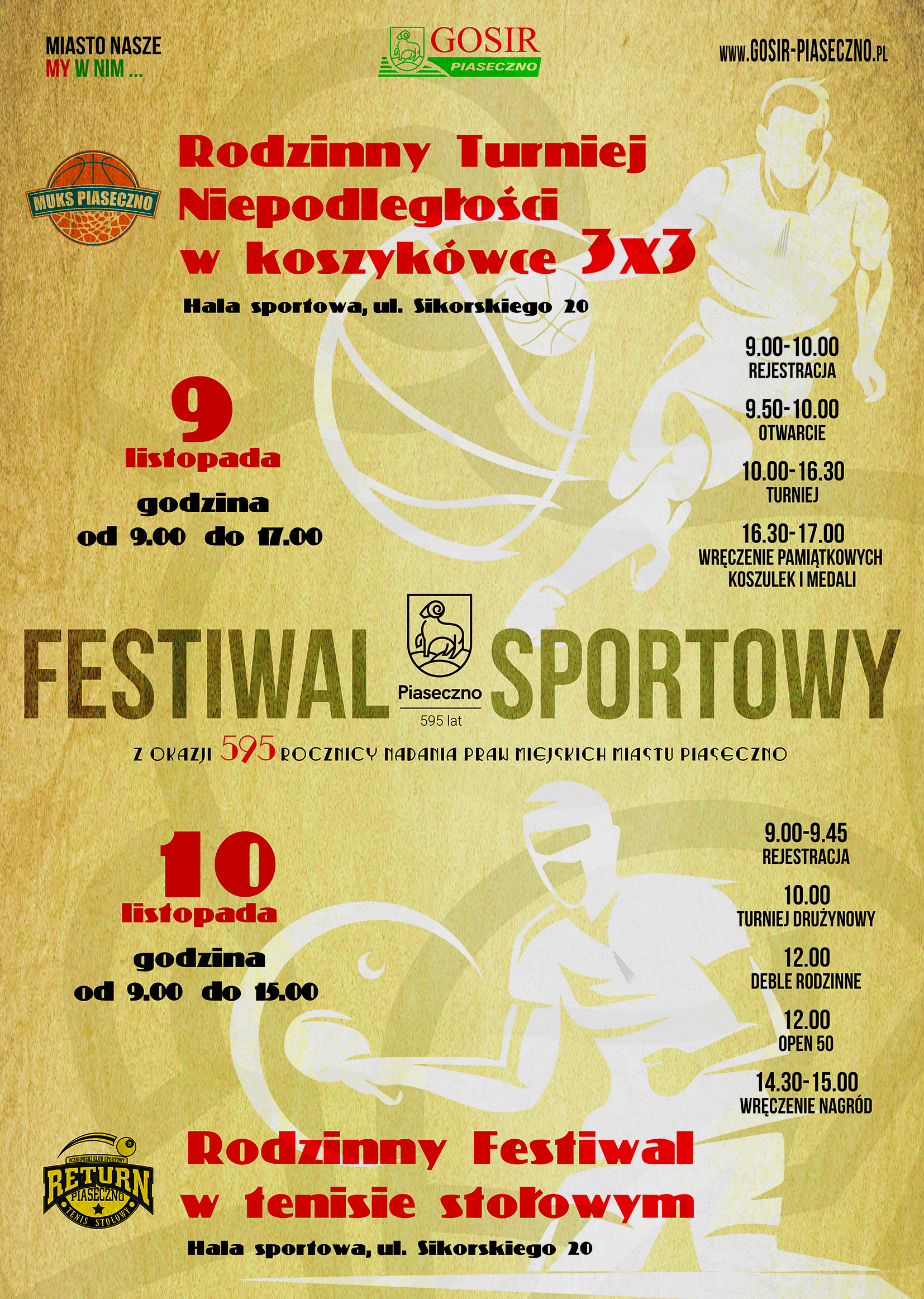 W najbliższy weekend w sali Gminnego Ośrodka Sportu i Rekreacji odbędzie się sportowy festiwal z okazji 595-lecia praw miejskich dla Miasta Piaseczno. Podczas festiwalu odbędą się dwie rodzinne imprezy: turniej koszykówki 3x3 oraz turniej tenisa stołowego.