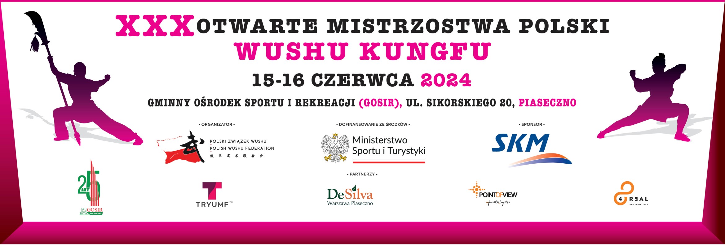 W dniach 15-16.czerwca 2024 roku Hali Sportowej GOSiR Piaseczno, ul . Sikorskiego 20 odbędą się zawody sportowe XXX Otwarte Mistrzostwa Polski Wushu Kungfu.