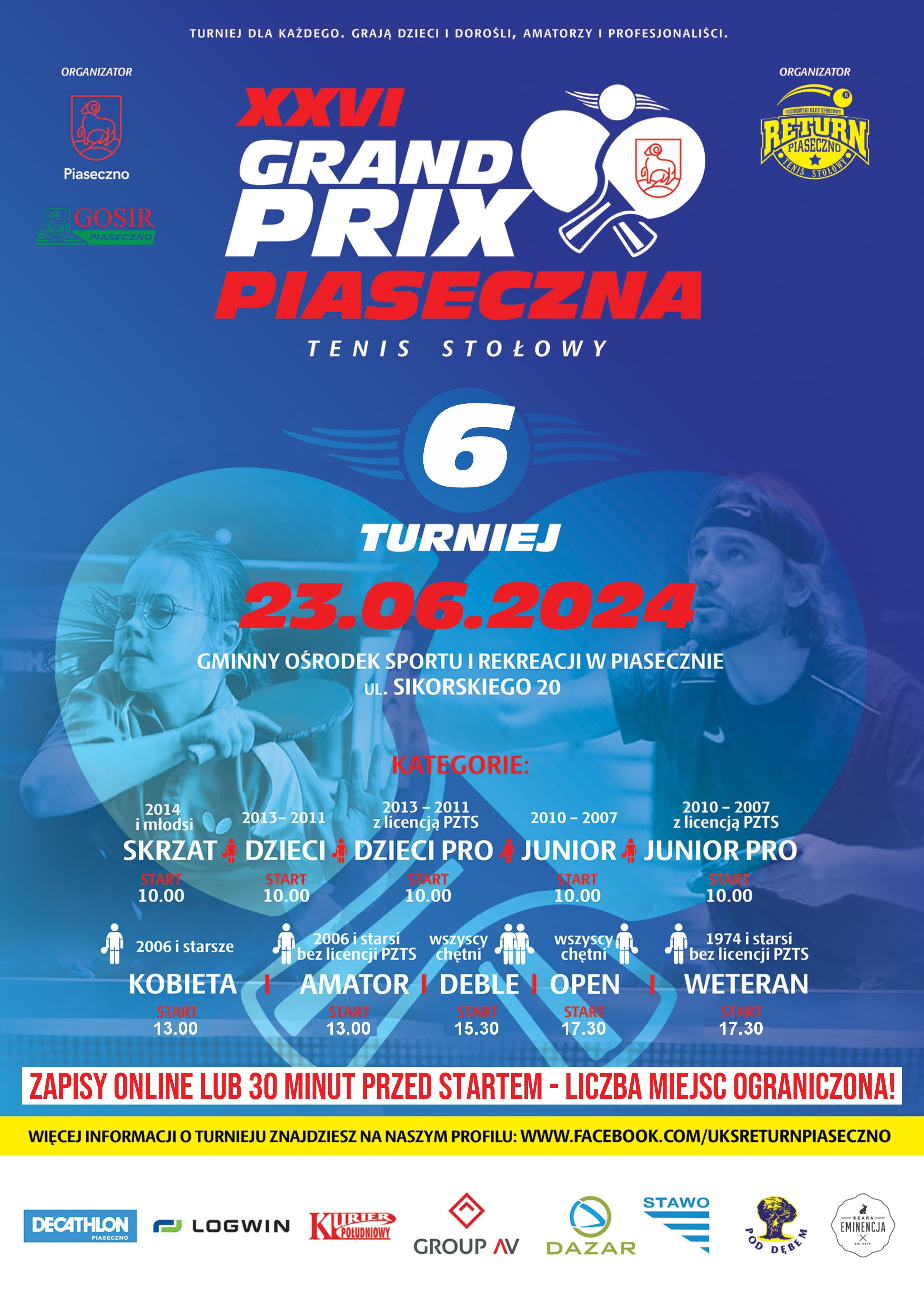 Już w najbliższą niedzielę 23 czerwca rozegramy szósty turniej XXVI edycji Grand Prix Piaseczna w tenisie stołowym. Turniej rozgrywany nieprzerwanie od 25 lat jest wyjątkowy pod wieloma względami. Oto niektóre powody, dla których warto przyjść na halę Gminnego Ośrodka Sportu i Rekreacji w Piasecznie: