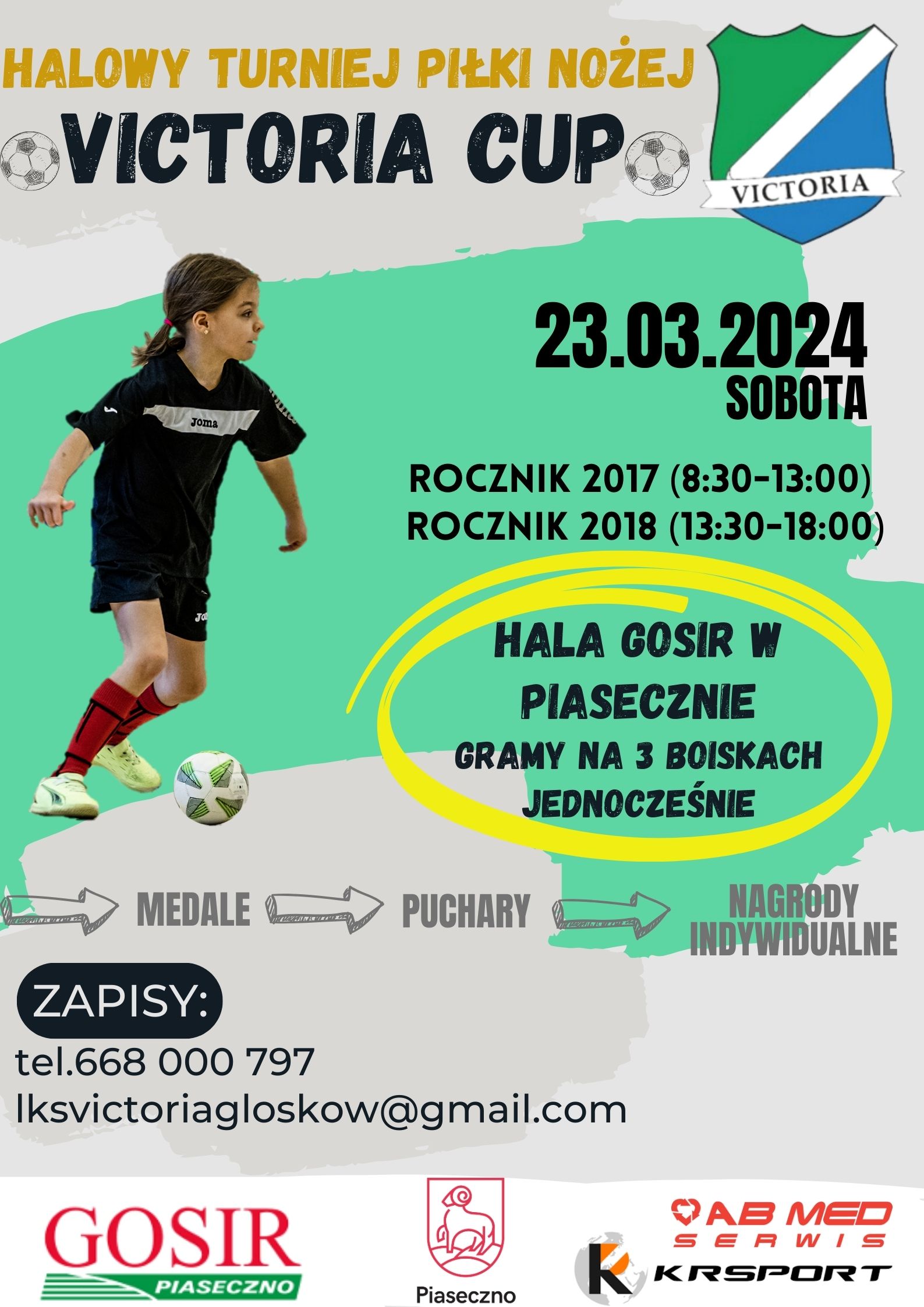 Zapraszamy w sobotę (23.03.2024) na turniej piłki nożnej VICTORIA CUP, który odbędzie się na hali GOSiR przy ul. Gen. Wł. Sikorskiego 20 w Piasecznie. Turniej odbędzie się z okazji 40-lecia Klubu LKS Victoria Głosków.