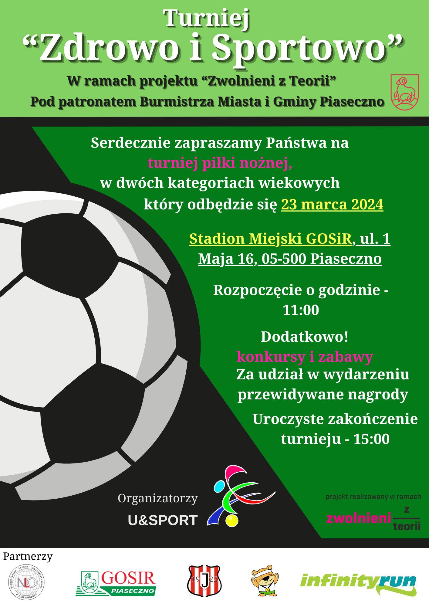 Serdecznie zapraszamy na amatorski turniej piłki nożnej, który odbędzie się 23.03.2024 na naszym stadionie, dla dzieci w dwóch kategoriach wiekowych 6 i 9 lat. Organizatorem turnieju jest grupa U&SPORT.