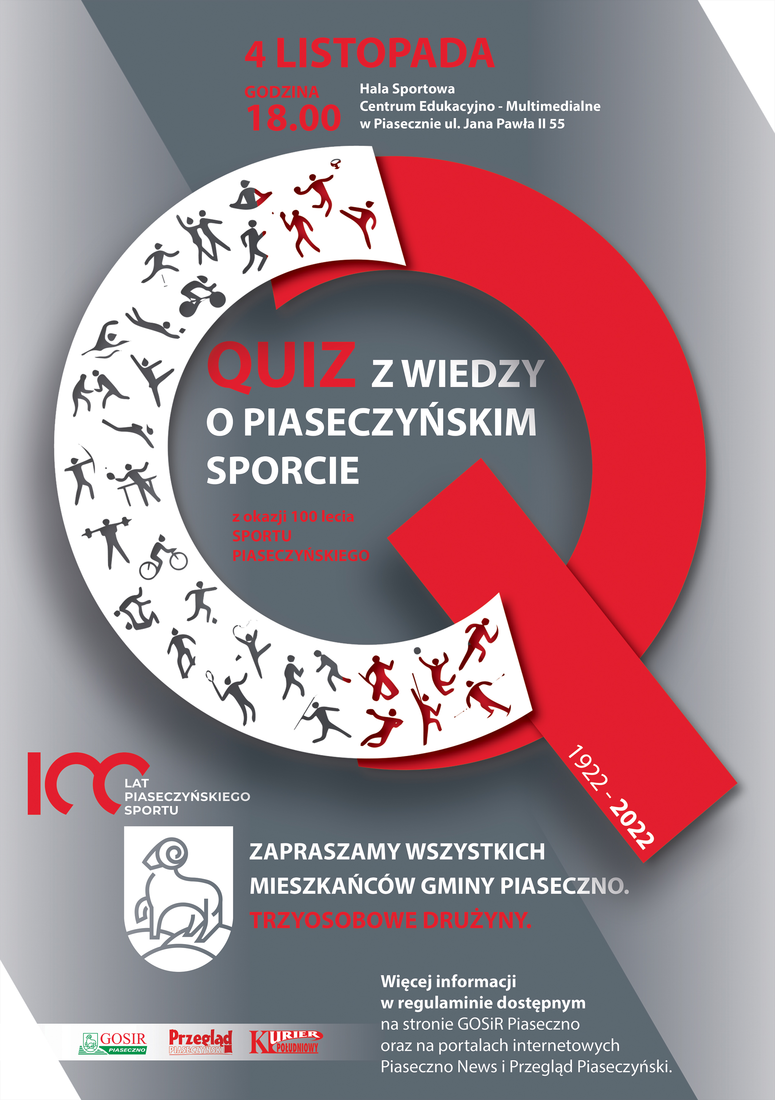 Serdecznie zapraszamy wszystkich mieszkańców Gminy Piaseczno do udziału w Quizie z wiedzy o piaseczyńskim sporcie. Konkurs odbędzie się 4 listopada 2022 roku o godzinie 18:00 w hali sportowej znajdującej się w Centrum Edukacyjno-Multimedialnym przy ul. Jana Pawła II 55 w Piasecznie. W quizie startować mogą wszyscy mieszkańcy Gminy Piaseczno oraz przedstawiciele stowarzyszeń i klubów sportowych oraz reprezentanci szkół podstawowych i ponadpodstawowych.