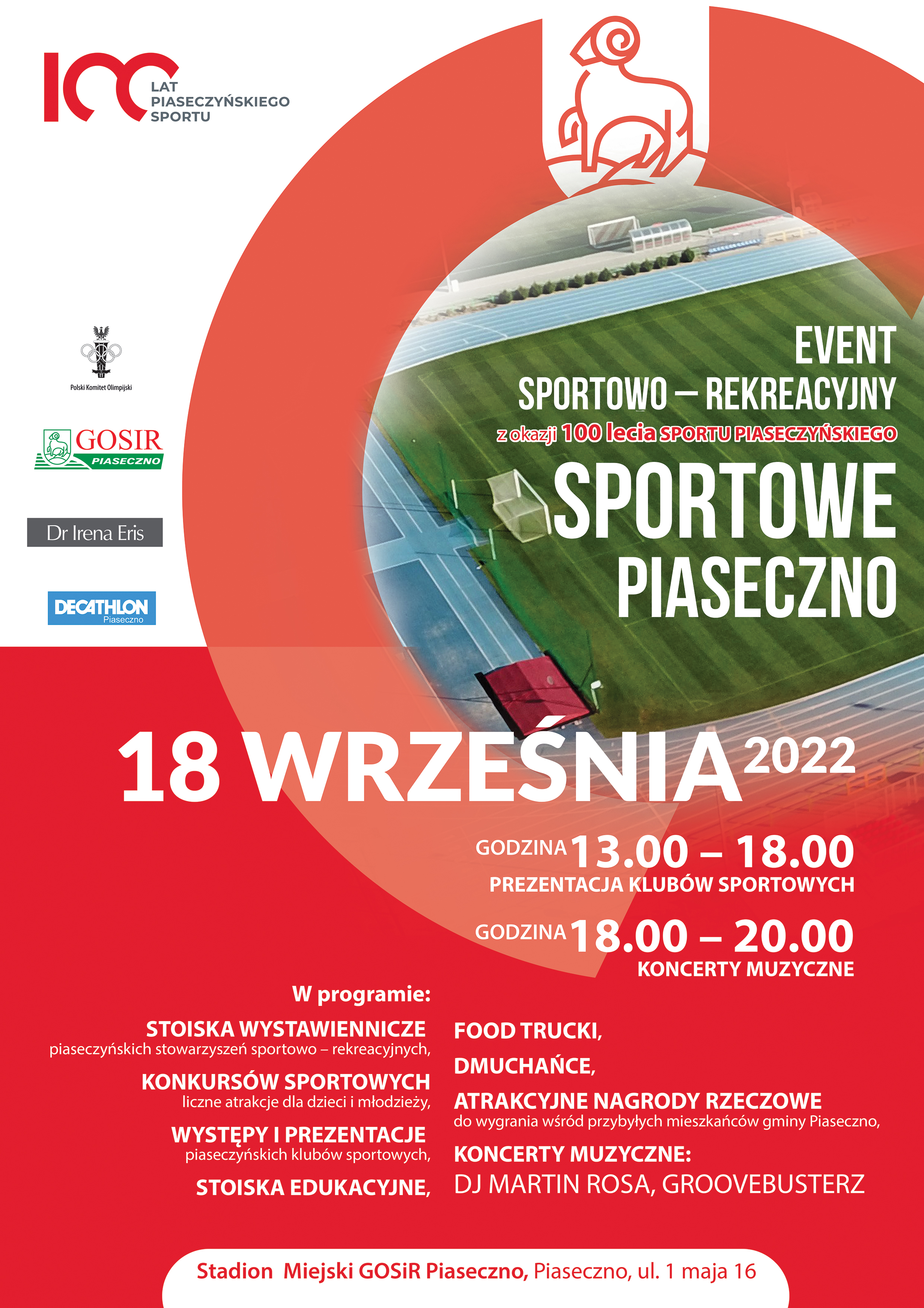 Serdecznie zapraszamy wszystkich miłośników sportu na event sportowo-rekreacyjny "Sportowe Piaseczno", który 18 września odbędzie się na Stadionie Miejskim przy ul. 1 Maja 16 w Piasecznie. Będzie to impreza główna z okazji jubileuszu 100-lecia Piaseczyńskiego Sportu. Swoją obecność potwierdziło ponad 30 klubów z kilkunastu dyscyplin sportowych, a oprócz tego podczas wydarzenia czeka na wszystkich moc atrakcji. W związku z obawami o opady deszczu impreza odbędzie się pod balonem dzięki czemu będziemy mogli bez przeszkód świętować sportowy jubileusz.