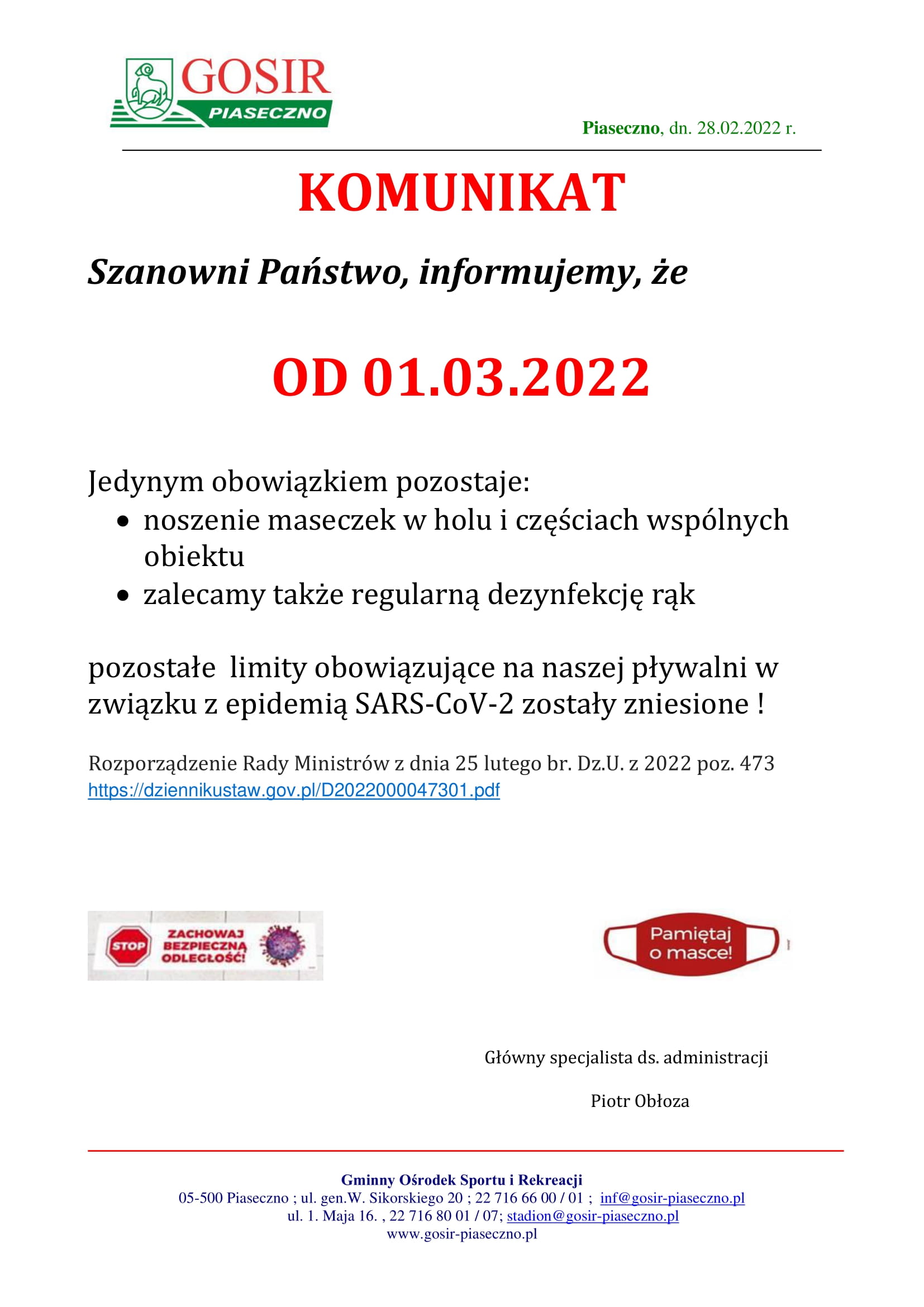 limity obowiązujące na pływalni GOSiR w związku z epidemią SARS-CoV-2 zostały zniesione !