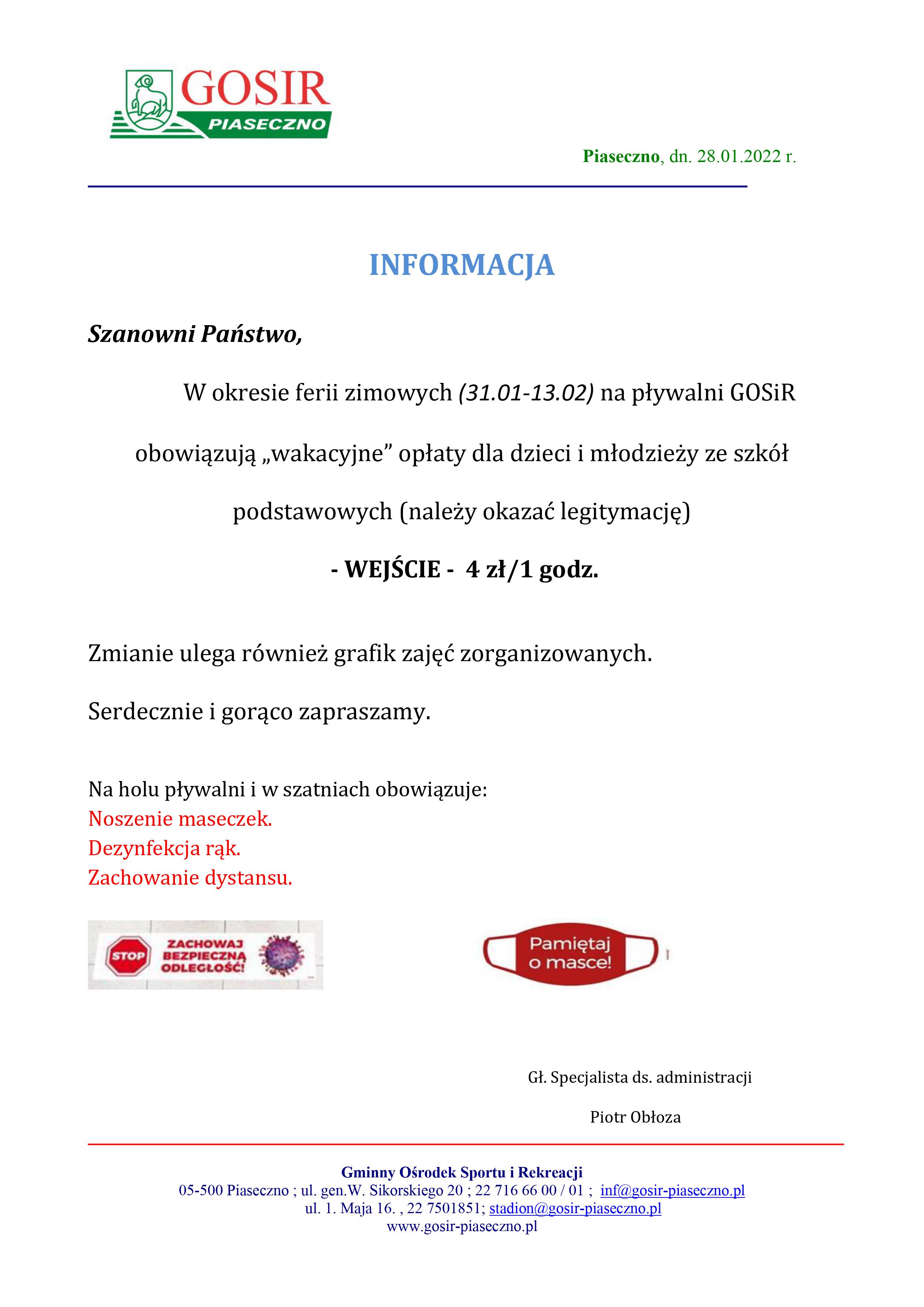 W okresie ferii zimowych (31.01-13.02) na pływalni GOSiR obowiązują „wakacyjne” opłaty dla dzieci i młodzieży ze szkół podstawowych (należy okazać legitymację)