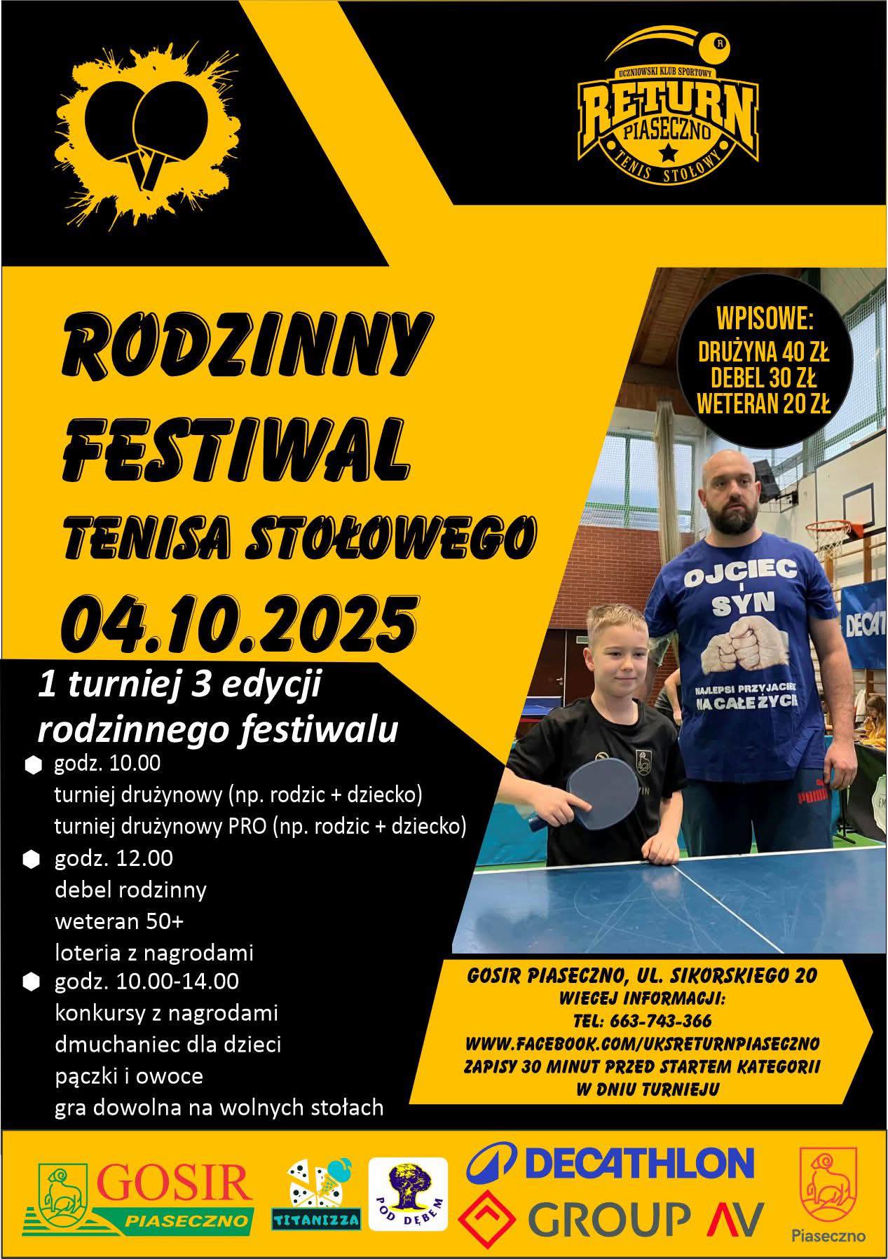 W sobotę 4 października w sali Gminnego Ośrodka Sportu i Rekreacji odbędzie się Rodzinny Festiwal Tenisa Stołowego. Będzie to świetna okazja do aktywnego spędzenia wolnego czasu w gronie najbliższych. Na uczestników czekają turnieje w trzech kategoriach: drużyna rodzinna, deble rodzinne oraz weteran 50+. Ponadto w trakcie zawodów będą odbywać się konkursy z nagrodami oraz loteria nagród. Drużyny są dwuosobowe – w każdej z nich musi wystąpić przynajmniej jedno dziecko poniżej 18 roku życia.