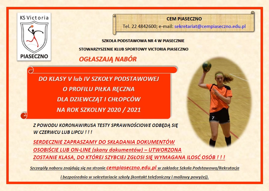 Szkoła Podstawowa nr 4 w Piasecznie (znajdująca się w budynku CEM Piaseczno) wraz z KS Victoria Piaseczno uruchamiają kolejną klasę sportową o profilu piłki ręcznej - tym razem będzie to klasa V lub IV.