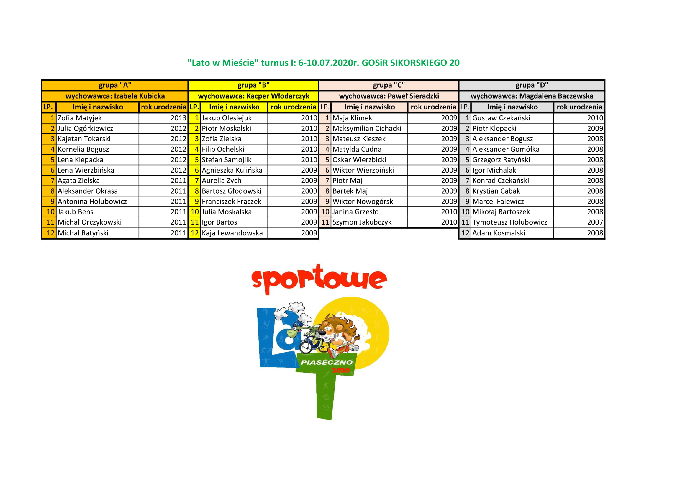 Poniżej przedstawiamy listy uczestników oraz plan zajęć na I turnus (06-10.07.2020r.) półkolonii "Sportowe Lato w Mieście 2020r."