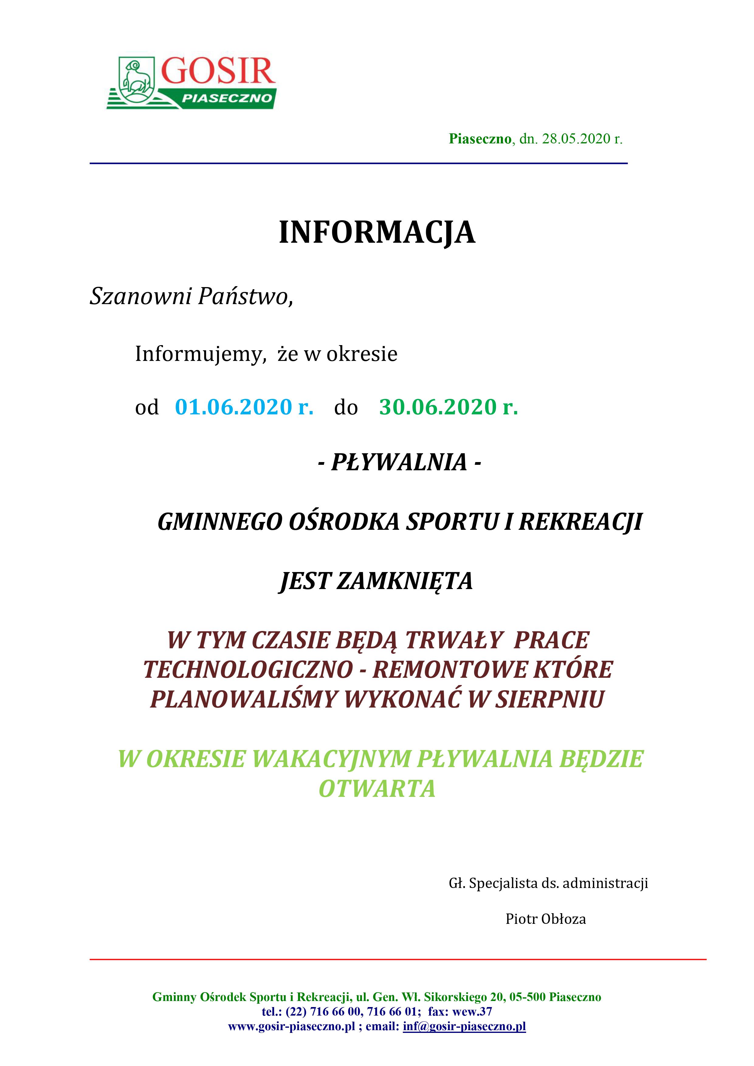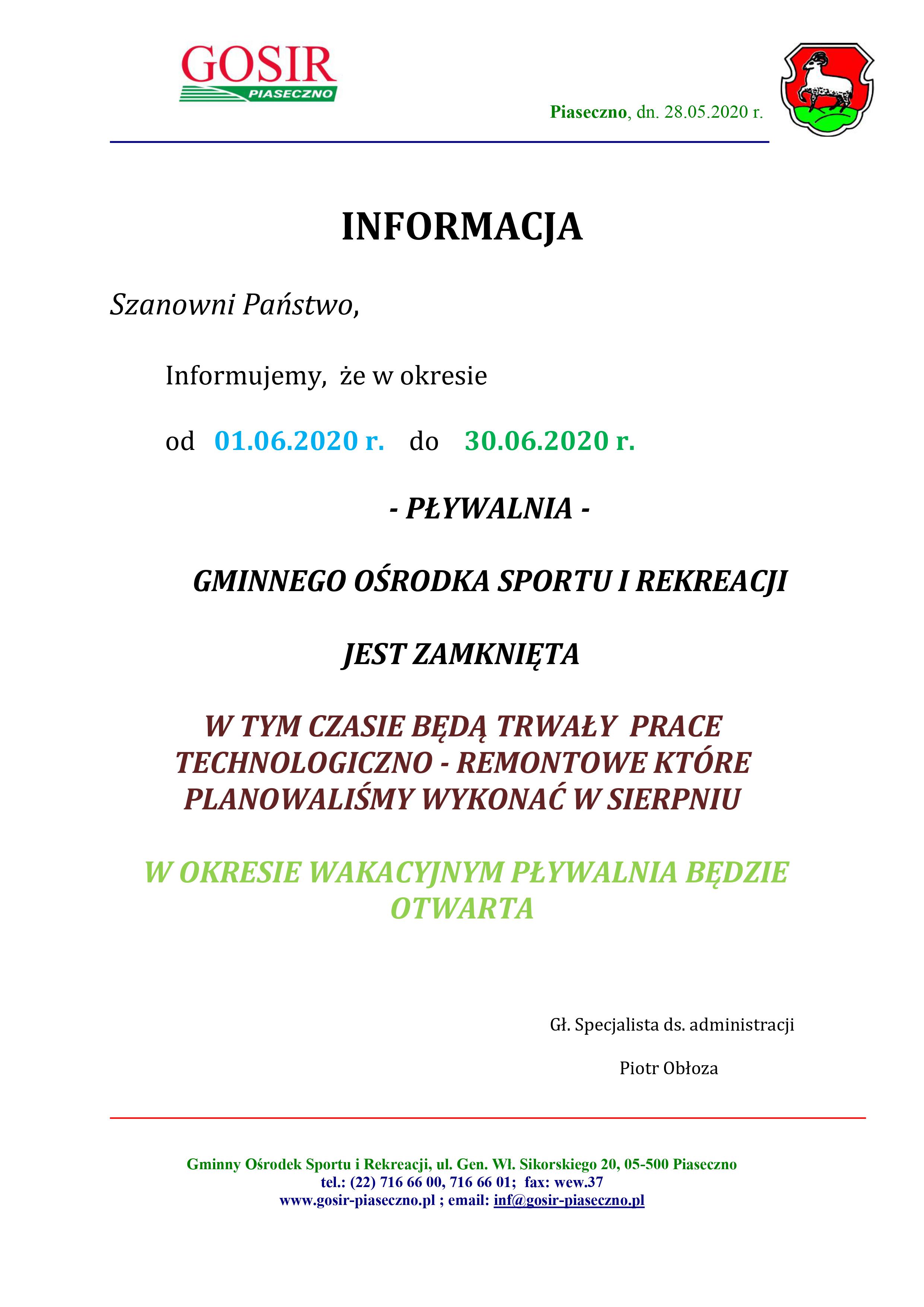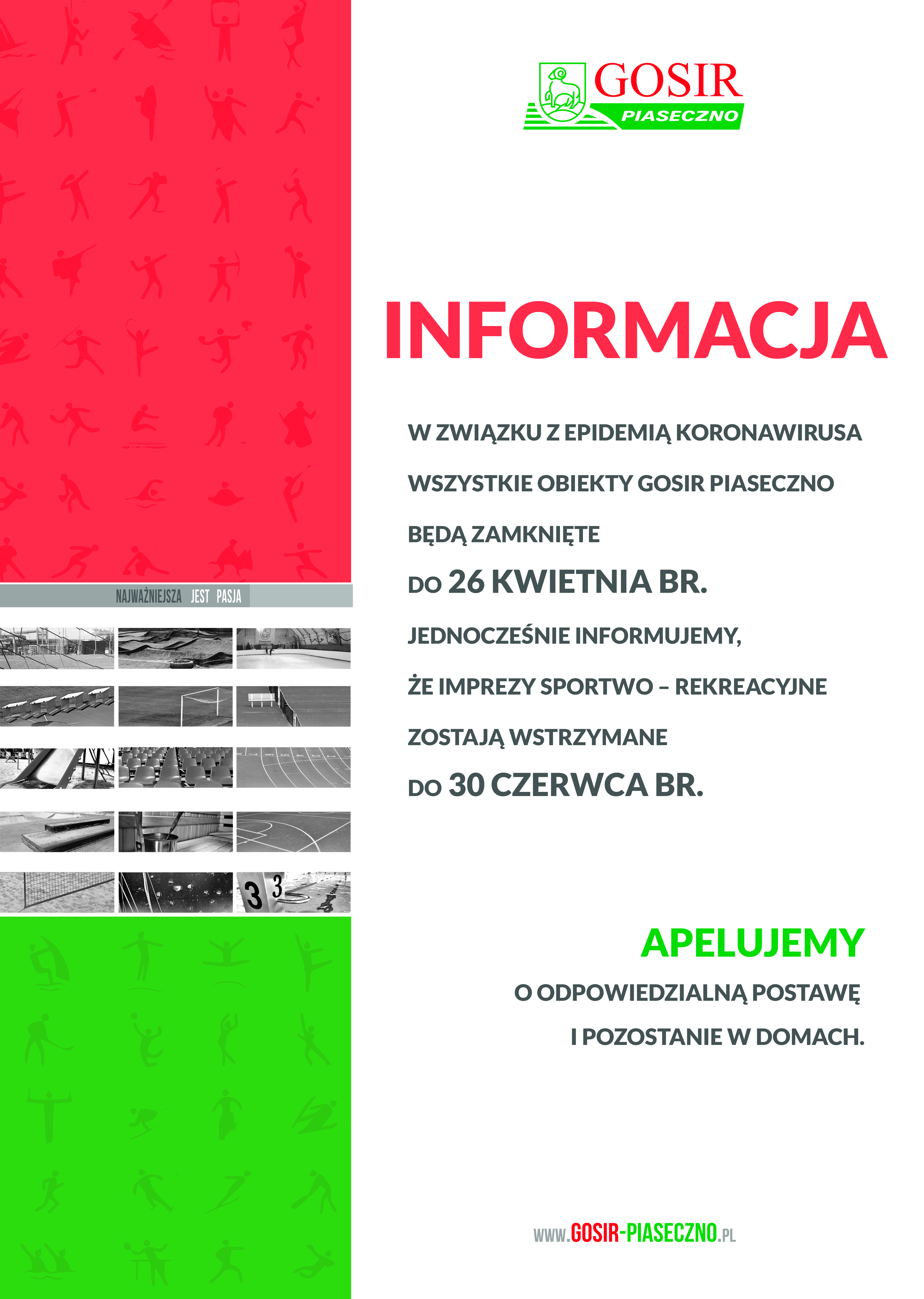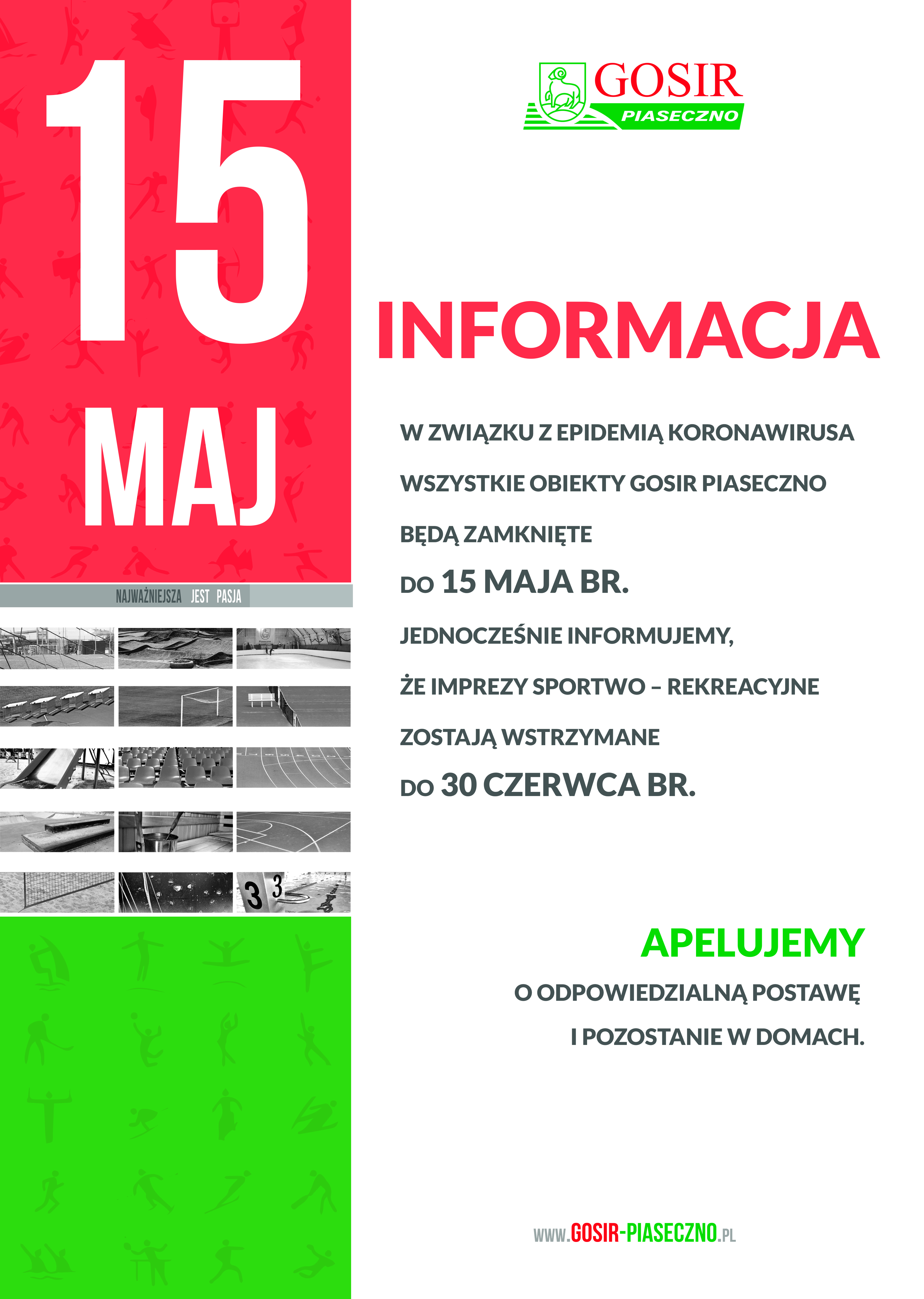 że od 18 maja br. wszystkie obiekty GOSiR Piaseczno z wyjątkiem pływalni