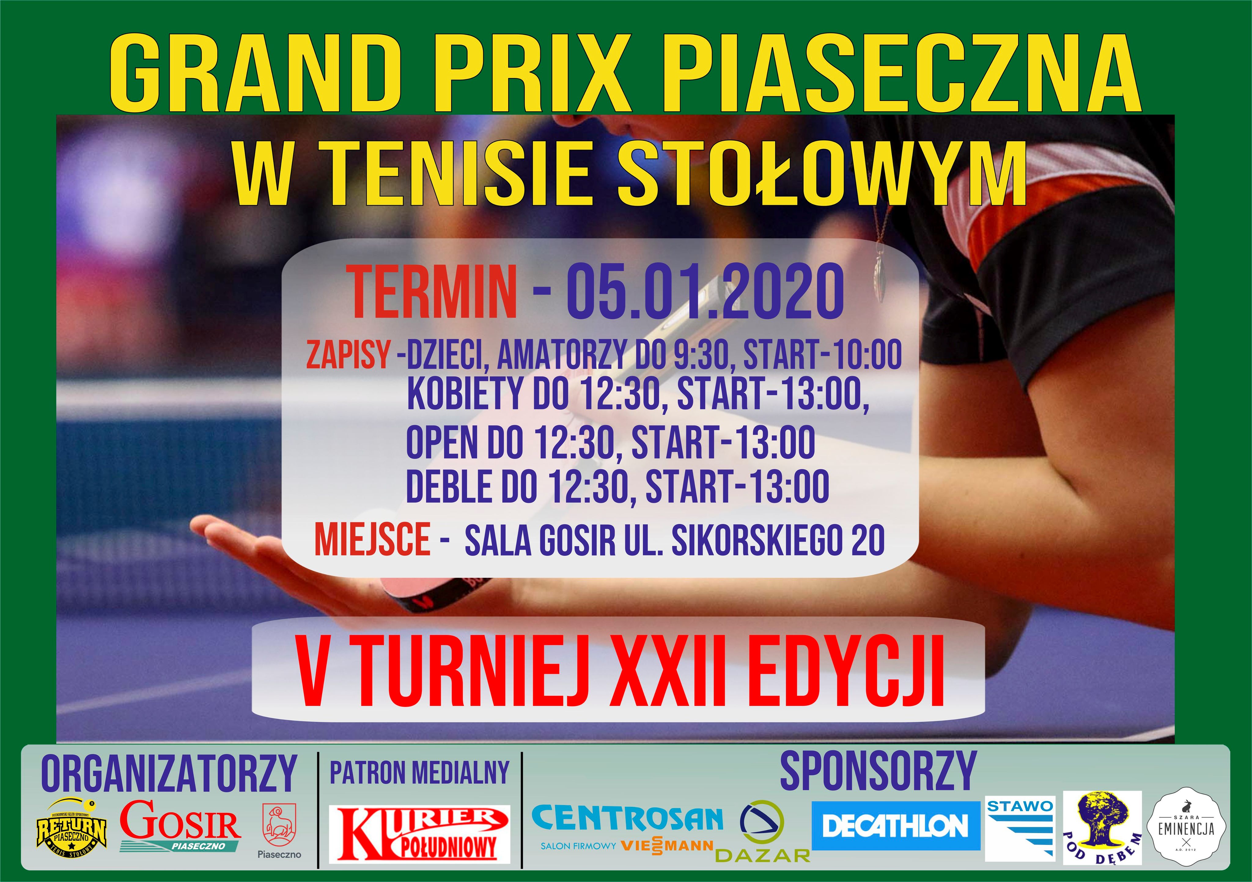 W najbliższą niedzielę zainaugurujemy zmagania przy pingpongowych stołach w 2020 roku. W sali Gminnego Ośrodka Sportu i Rekreacji w Piasecznie odbędzie się 5-ty turniej XXII edycji Grand Prix Piaseczna w tenisie stołowym. Będzie to kolejna szansa na wywalczenie punktów do klasyfikacji generalnej, spośród której 12 najlepszych graczy będzie miała prawo startu w czerwcowym turnieju TOP-12. Zawody odbędą się na 20 stołach i rozegrane zostaną w 8 kategoriach. Wziąć udział mogą wszyscy zainteresowani bez względu na płeć, wiek czy poziom zaawansowania.