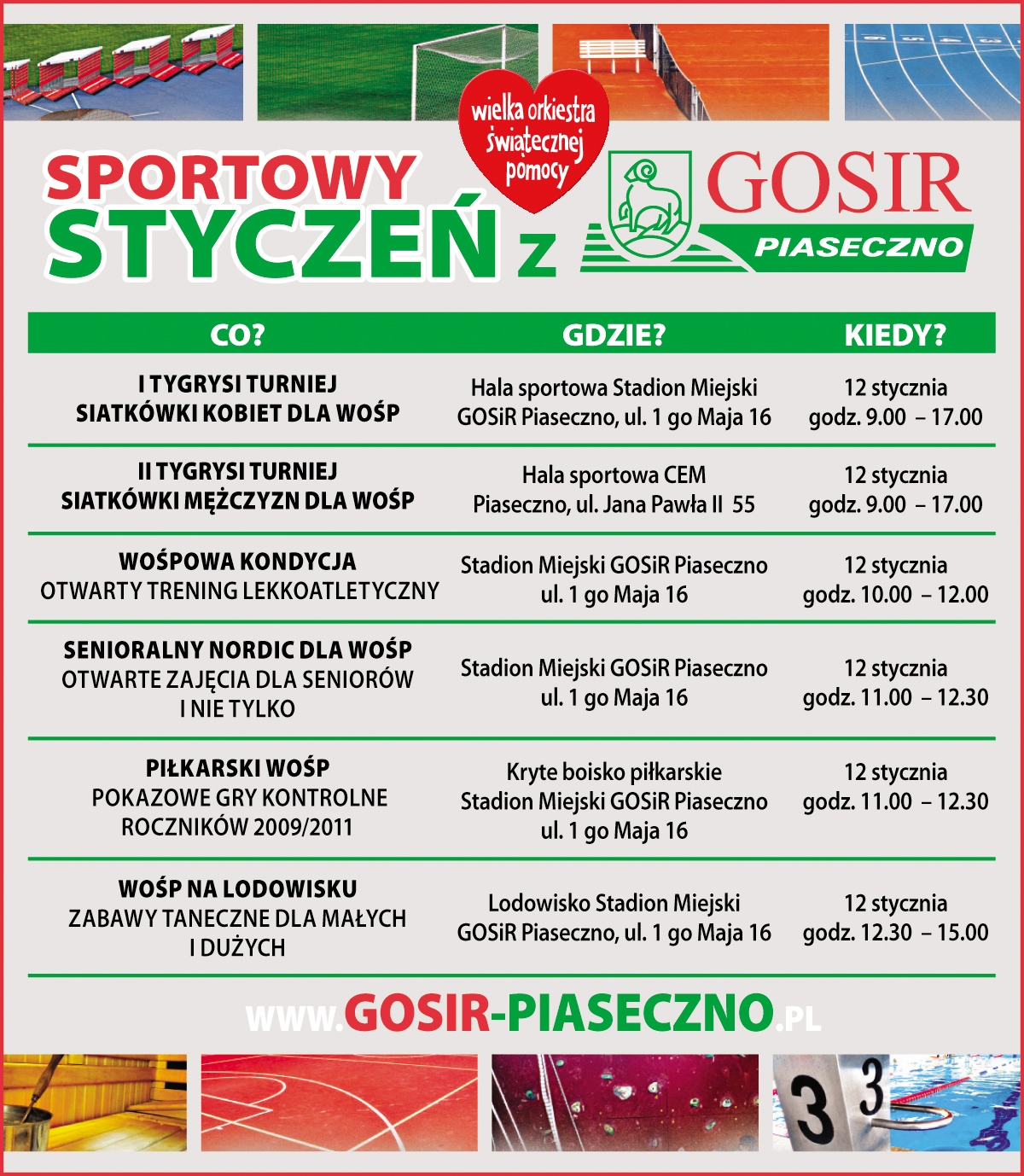 Gminny Ośrodek Sportu i Rekreacji w Piasecznie zachęca mieszkańców do wzięcia udziału w wydarzeniach sportowych organizowanych w ramach finału WOŚP w Piasecznie.