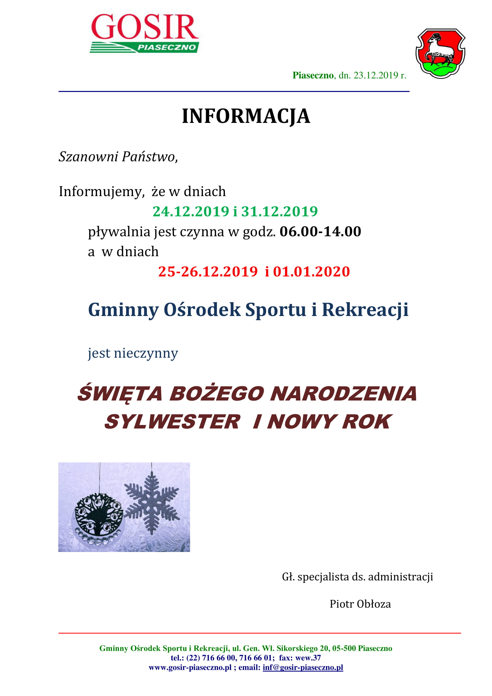 – Osobiście w GOSiR Piaseczno, ul. Sikorskiego 20, pokój 44 w godz. 9:00-15:00. Od 22.01.2020 r po konsultacji telefonicznej zapisy odbywać się będą na Stadionie Miejskim w budynku głównym, ul. 1-go Maja 16 w Piasecznie, pok. 19.