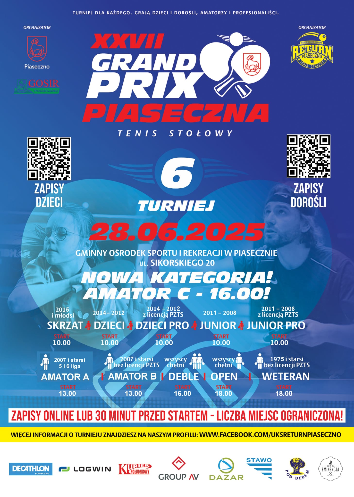 W sobotę 28 czerwca rozegramy kolejny turniej XXVII edycji Grand Prix Piaseczna w tenisie stołowym.