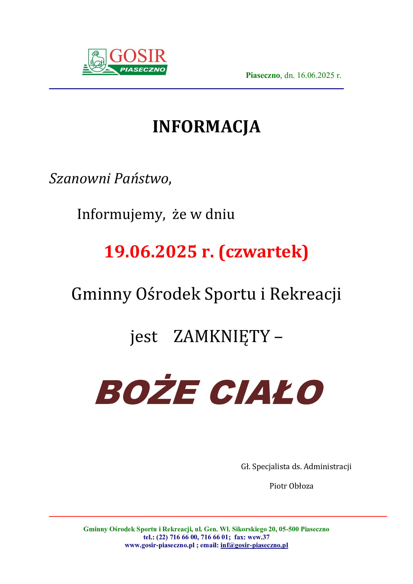 Z radością informujemy, że dnia 06 czerwca 2025 r. Gminny Ośrodek Sportu i Rekreacji w Piasecznie oraz p. Wiktor Topolski podpisali porozumienie, którego założeniem jest współpraca przy organizacji Ligi Piłkarskiej w Piasecznie. O tym projekcie więcej usłyszycie niebawem, a my cieszymy się, że dyrektor Łukasz Kamiński wychodzi naprzeciw inicjatywie zaproponowanej przez młodych mieszkańców. Wierzymy, że utworzenie amatorskiej ligi piłkarskiej znajdzie wielu zwolenników wśród mieszkańców Gminy Piaseczno.